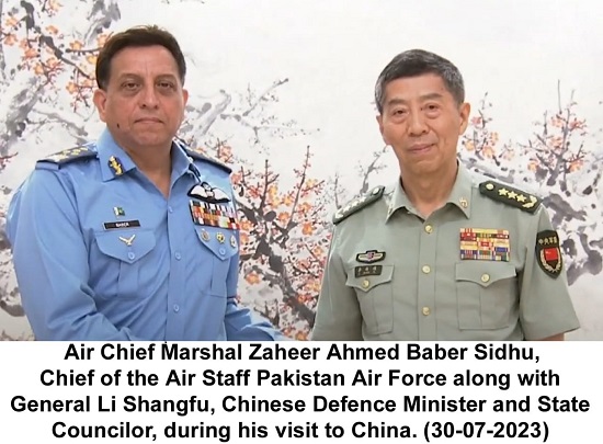 Beijing- 30 July, 2023: Air Chief Marshal Zaheer Ahmed Baber Sidhu, Chief of the Air Staff, Pakistan Air Force called on various dignitaries during his visit to China. In these meetings, the Air Chief called on Chinese Defence Minister and State Councilor General Li Shangfu, People’s Liberation Army Air Force Commander General Chang Dingqiu, Chief of Equipment Development Department General Xu Xueqiang and Director General Bureau of Military Equipment and Technical Cooperation (Bometec) Major General Fan Jianjun.