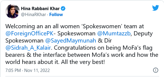 Minister of State for Foreign Affairs Hina Rabbani Khar welcomed the “all  ‘Spokeswomen’ team”.“Congratulations on being MOFA’s flag bearers and the interface between MOFA’s work and how the world hears about it. All the very best!” she tweeted.