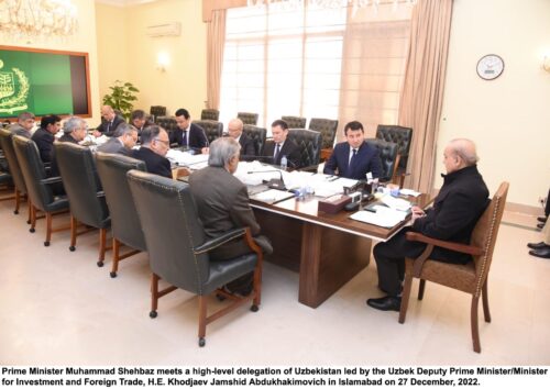 Islamabad: 27 Dec 2022 – Prime Minister Muhammad Shehbaz Sharif received High level delegation from Uzbekistan led by Deputy Prime Minister /Minister for Investment and Foreign Trade H.E. Khodjaev Jamshid Abdukhakimovich today in Islamabad. The delegation apprised the Prime Minister about their meetings with economic Ministries of Pakistan during which it was agreed to enhance economic and trade ties between the two countries.