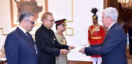 ISLAMABAD: March 15 – The Ambassador-designate of Portugal to Pakistan Manuel Fredrico Pinheiro da Silva presenting his credentials to President Dr. Arif Alvi at Aiwan-e-Sadr. APP/TZD/ZID