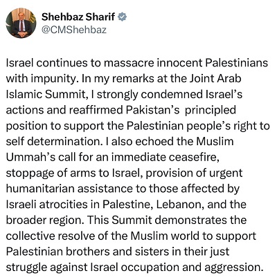 Addressing an Arab-Islamic Extraordinary Summit, the prime minister said that as Ummah, they were duty bound by their religion and conscience to stand resolutely with the people of Palestine more than even before, ‘we should not let this genocide and oppression to persist.’