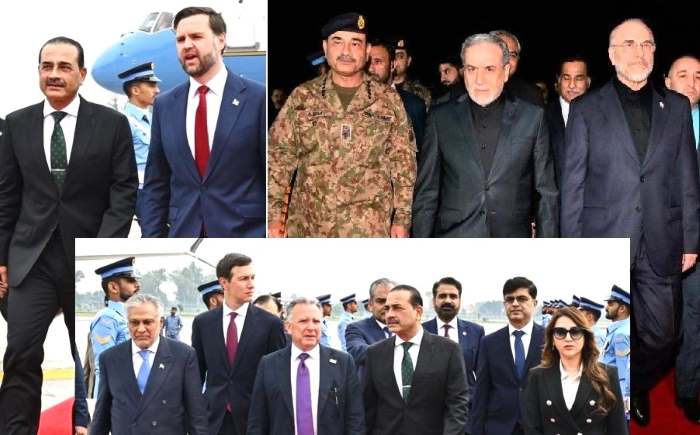A high-powered delegation of Iran led by Speaker of the Iranian Parliament Mohammad Bagher Ghalibaf along with Foreign Minister Abbas Araghchi, US delegation led by Vice President H.E. J.D. Vance along with Special Envoy Mr. Steve Witkoff and Mr. Jared Kushner were received by DPM/FM Ishaq Dar along with Speaker National Assembly Sardar Ayaz Sadiq, Chief of Defence Forces & Chief of Army Staff Field Marshall Syed Asim Munir and Minister for Interior Syed Mohsin Raza Naqvi.