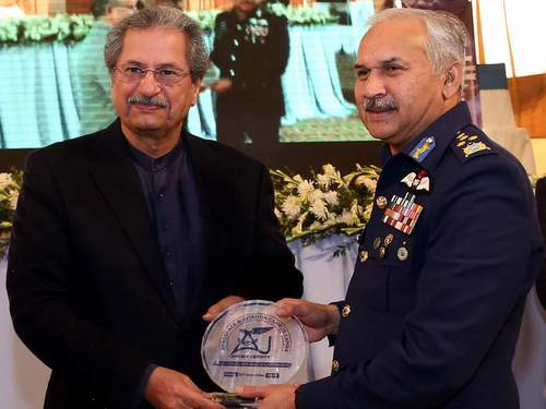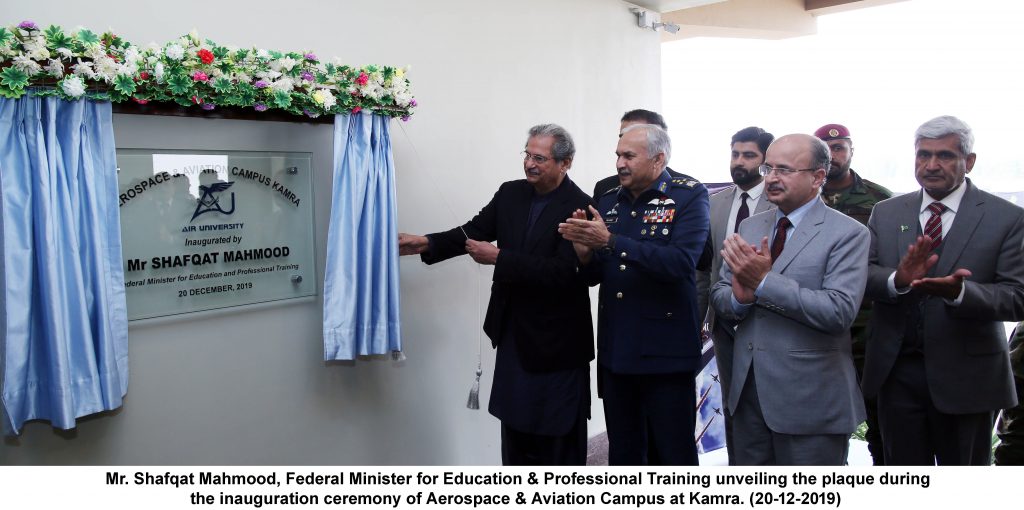 Islamabad; 20 Dec 2019-In a landmark event in the history of PAF, the inauguration ceremony of Air University Aerospace & Aviation Campus was held at Aviation City Kamra. Mr. Shafqat Mahmood, Federal Minister for Education and Professional Training was the chief guest at the occasion. Air Chief Marshal Mujahid Anwar Khan, Chief of the Air Staff, Pakistan Air Force was also present at the occasion. Malik Amin Aslam, Adviser to Prime Minister of Pakistan for Climate Change along with former air chiefs, high ranking defence and civil officers and heads of various academic institutions attended the ceremony. Air Vice Marshal (Retd) Faaiz Amir, Vice Chancellor Air University in his welcome address highlighted the salient features of this campus.