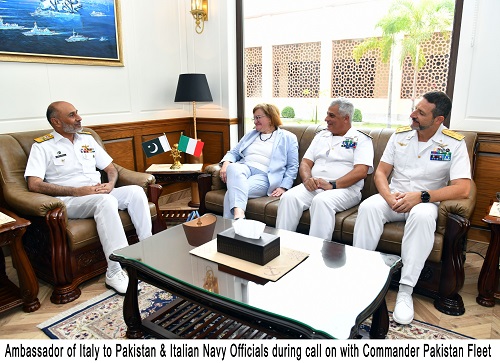 Following the arrival, an Italian delegation led by the Ambassador of Italy, Marilina ARMELLIN, along with Rear Admiral Stefano BARBIERI, Capability Director of the Italian Defence General Staff, called on Commander Pakistan Fleet, Rear Admiral Abdul Munib. During the meeting, matters of mutual interest including interoperability, avenues for future collaboration to enhance regional maritime security and defense cooperation were discussed.