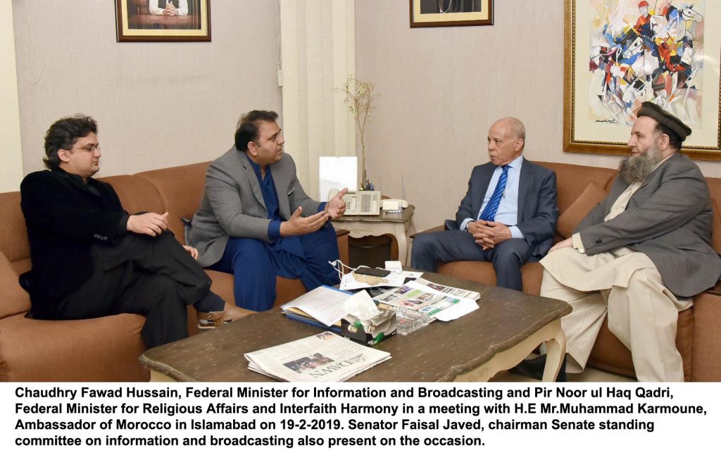 Chaudhry Fawad Hussain, Federal Minister for Information and Broadcasting and Pir Noor ul Haq Qadri, Federal Minister for Religious Affairs and Interfaith Harmony in a meeting with H.E Mr.Muhammad Karmoune, Ambassador of Morocco in Islamabad on 19-2-2019. Senator Faisal Javed, chairman Senate standing committee on information and broadcasting also present on the occasion.