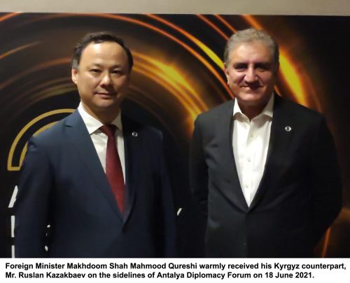 Islamabad; Foreign Minister Makhdoom Shah Mahmood Qureshi had a bilateral meeting with his Kyrgyz counterpart Mr. Ruslan Kazakbaev on the sidelines of Antalya Diplomacy Forum on 18 June 2021.