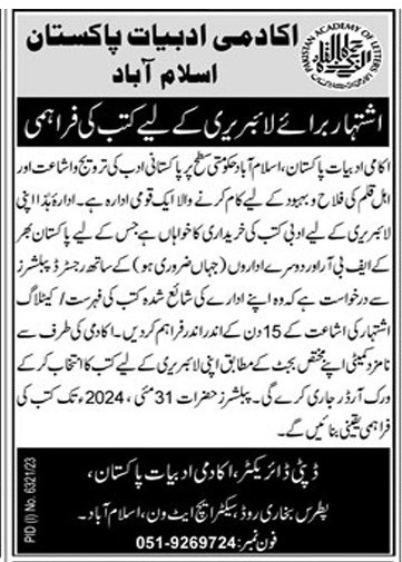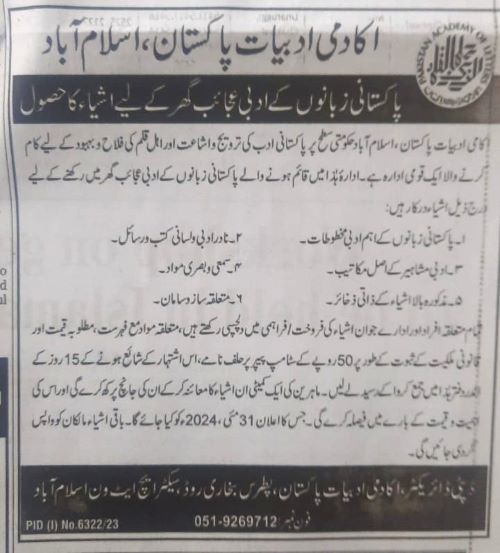 In this state of affairs, two advertisements have been published in the newspapers on 21 April 2024 to buy literary books for library and equipment for literary museum. This is first time in the history of PAL. Secondly, the person to contact is a Deputy Director while phone numbers are different. Simple Deputy Director is another objectionable matter. There are many deputy directors under one Director General.