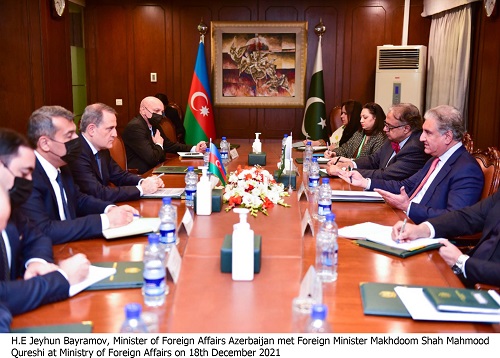 Islamabad: Foreign Minister Makhdoom Shah Mehmood Qureshi welcomed the distinguished guest Foreign Minister of Azerbaijan Jehon Berumov who arrives in Islamabad on 18 Dec 2021. Both leaders held delegation level talks at MOFA of Pakistan in which promotion of cooperation was discussed in detail.