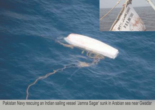 KARACHI, 11 Aug 22: On 9th August, an Indian sailing vessel ‘Jamna Sagar’ sunk in Arabian sea near Gwadar with 10 Crew members onboard. On responding to distress call, Pakistan Maritime Information Centre requested a nearby merchant ship MT KRUIBEKE to provide necessary assistance to the stranded crew of drowning sailing vessel. The merchant ship eventually recovered 9 crew member and continued voyage to its next port Dubai and onward disembarked the crew.