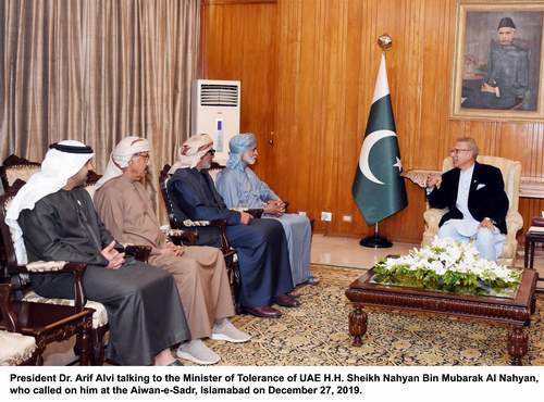 Islamabad;27 Dec 2019-Pakistan and UAE enjoyed close and cordial fraternal relations based on the solid foundations of a shared faith, culture and heritage, said President Dr. Arif Alvi, while talking to the Minister of Tolerance of UAE H.H. Sheikh Nahyan Bin Mubarak Al Nahyan, who called on him at the Aiwan-e-Sadr, Islamabad today. It was our endeavour to further strengthen the existing bilateral engagement at all levels and in all fields including trade, investment, energy, culture and tourism, he added. He also appreciated the efforts of the UAE for promoting regional peace and stability.