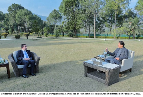 Minister for Migration and Asylum of Greece Mr. Panagiotis Mitarachi called on Prime Minister Imran Khan in Islamabad on February 7, 2022.