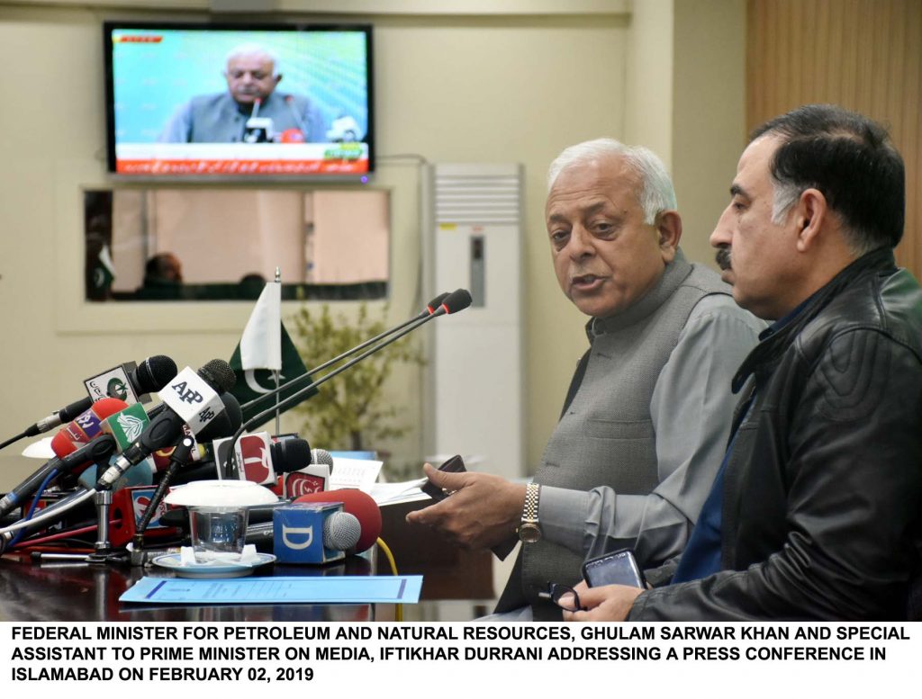 FEDERAL MINISTER FOR PETROLEUM AND NATURAL RESOURCES, GHULAM SARWAR KHAN AND SPECIAL ASSISTANT TO PRIME MINISTER ON MEDIA, IFTIKHAR DURRANI ADDRESSING A PRESS CONFERENCE IN ISLAMABAD ON FEBRUARY 02, 2019