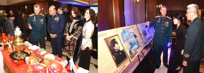 An exhibition was also arranged with posters and portraits related to the history of the defence forces formation journey of Russia. Defence Attache took the guests to a round to the exhibition and briefed them about different phases and events of the history.