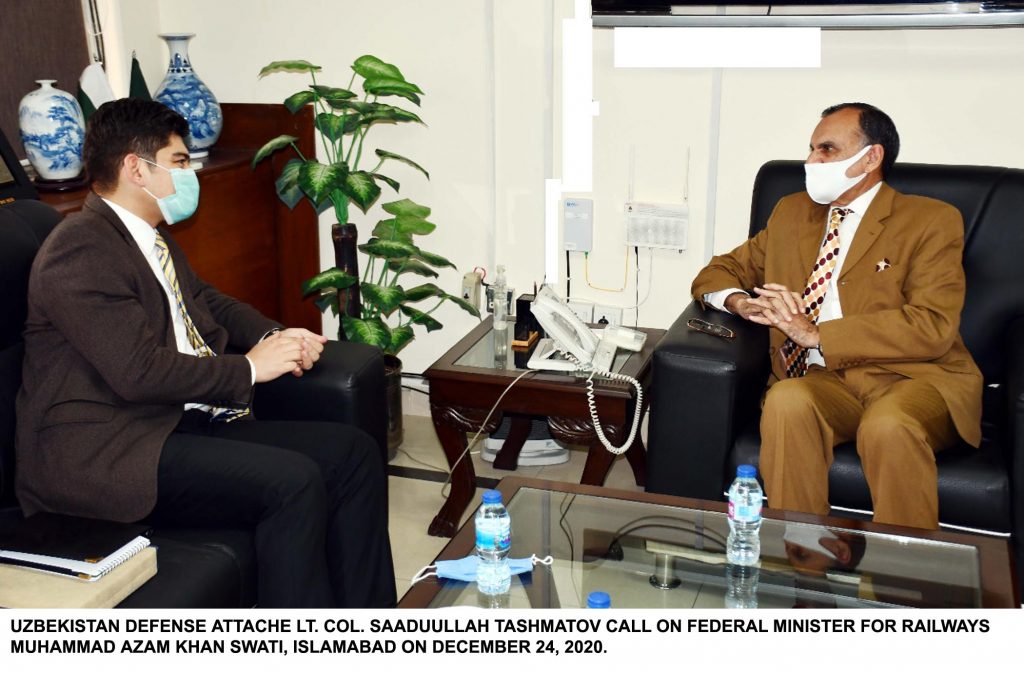 Uzbekistan the only country with direct connectivity with Pakistan in shape of flights, is now moving forward to ground connections , first in Railway. Acting Ambassador , Defence Attache Lt Col R Sadullah had a meeting with Minister of Railways Pakistan Mr Azam Sawati on 24 Dec 2020 at the later’s office. Both sides discussed different aspects of Railway connectivity and its impact on the development of the whole region.