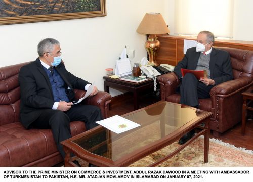 Islamabad; 7 Jan 2020 – The Ambassador of the Republic of Turkmenistan to Pakistan H.E Mr. Atadjan Movlamov called on Mr. Abdul Razak Dawood, Advisor to the Prime Minister on Commerce and Investment at the Ministry of Commerce (MOC) on 7th January, 2021.