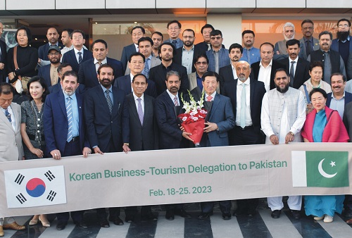 Islamabad: 22 Feb 2023 – Korean business delegation consist of 47 members, led by former Korean Ambassador to Pakistan, Dr. Song Jong-hwan visited The Federation of Pakistan Chambers of Commerce & Industry (FPCCI) Capital Office, Islamabad, The President FPCCI Irfan Iqbal Sheikh, Vice Presidents Amin Ullah Baig & Umar Masood ur Rehman, and other prominent Pakistani business leaders welcomed the delegation at FPCCI Capital Office, Islamabad and they have a very fruitful discussion regarding trade development between two countries.
