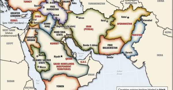 The map above is a 2006 proposed plan to redrawn the borders of the Middle East by Ralph Peters, a retired United States Army lieutenant colonel, author, and Fox News commentator. It was original published in the Armed Forces journal in an article titled Blood borders: How a better Middle East would look.